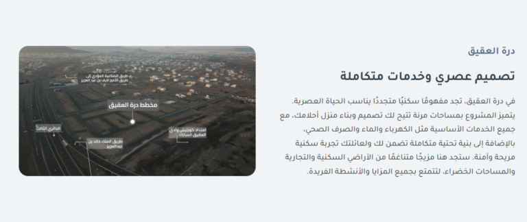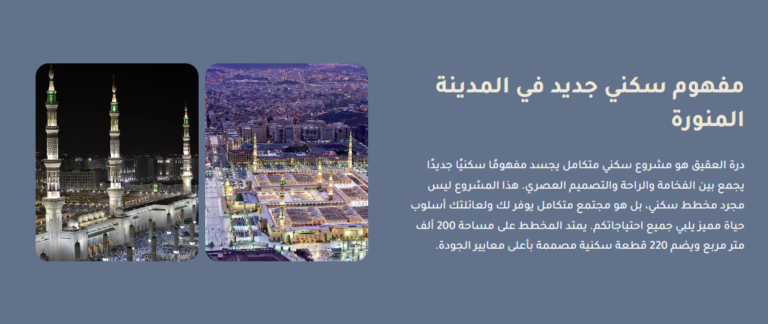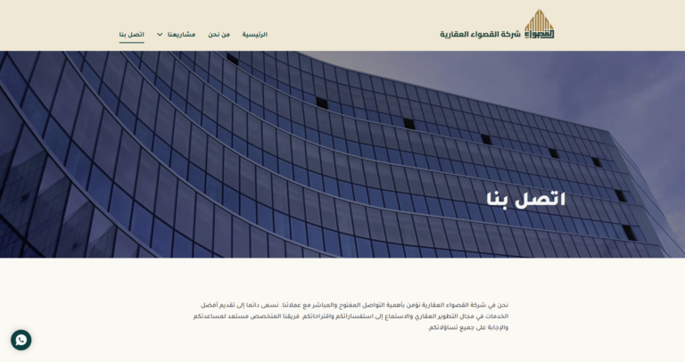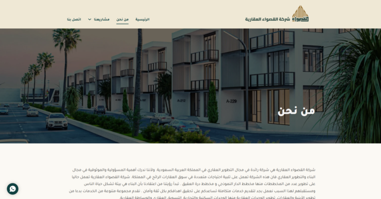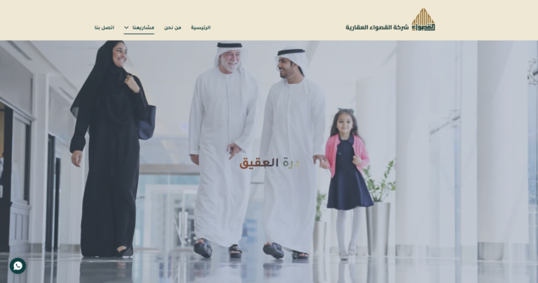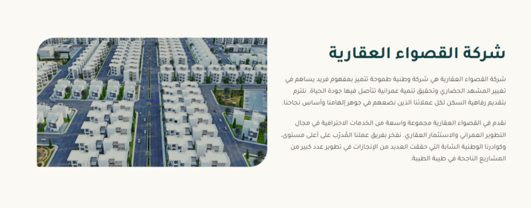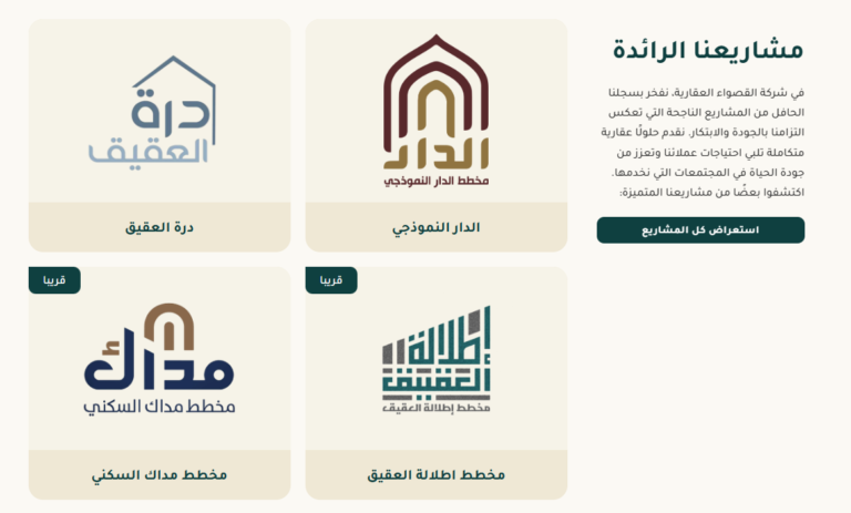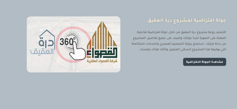 - محفظة المشاريع: محفظة جذابة بصريًا تعرض مشاريع القصواء الناجحة، بما في ذلك الميزات التفاعلية مثل الجولات الافتراضية.